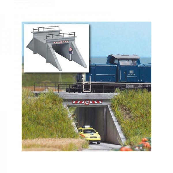 Paso subterráneo aplicable para escenas desde la década de los 50. Las partes del kit están hechas de un cartón especial que ha sido fabricado con la tecnología más reciente de corte láser. La barandilla consisten en material plástico. El paso subterráneo también es adecuado para un plan de doble vía. Signos de Road incluidos. Tamaño aprox.: 132 x 42 mm, 37 mm de altura